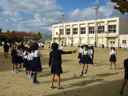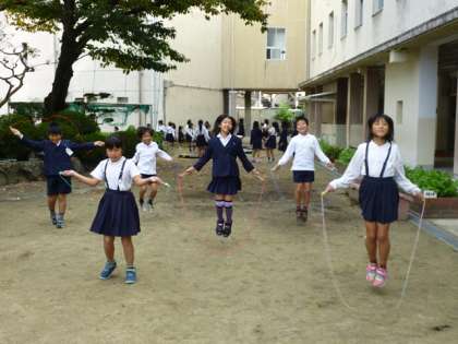 早くも運動場ではなわとびが花盛り。1年生から6年生までいろんな場所で子ども達が練習に励んでいます。