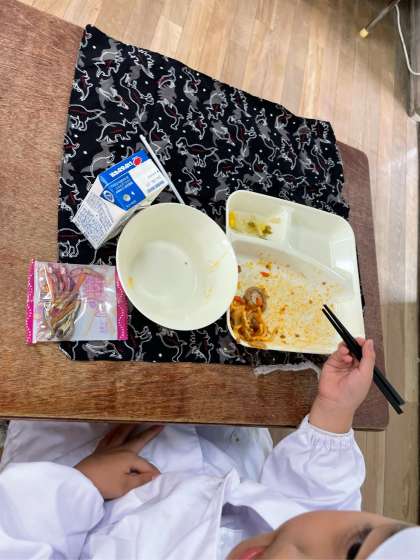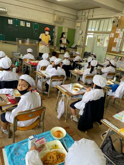 今日から一年生も自分たちで給食を運びました。おかず、牛乳、食器などをしっかり持って運んでいました。