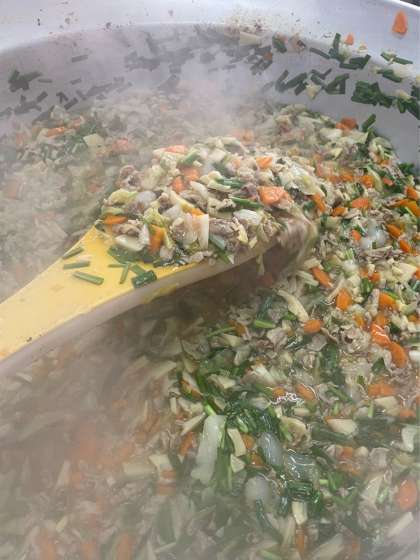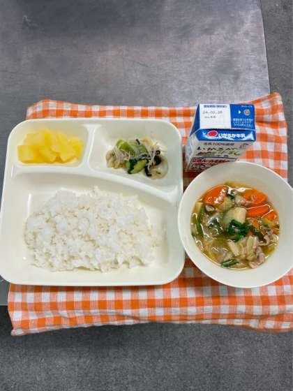 今日の中華煮には、豚肉、にんじん、玉ねぎ、キャベツ、たけのこ、にらが入った中華煮でした。どのクラスもよく食べていました。チンゲンサイともやしのしょうがあえは、しょうがあじがほのかにしておいしかったです。