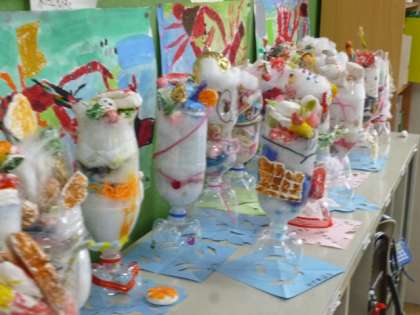 アイスクリームを形作る白い「綿」やトッピングのカラフルな「毛糸」が、器となるペットボトルにどんどん盛り付けられていきます。