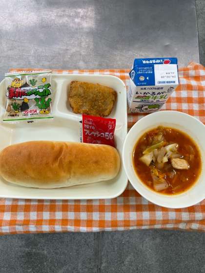 今日の給食では、鶏肉とキャベツ、玉ねぎ、トマト、にんじん、パセリなどの野菜が使われています。