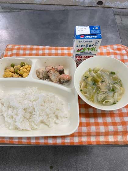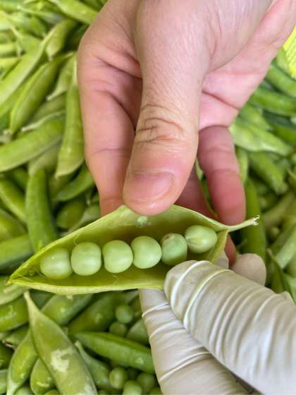 えんどうの旬(たくさん取れて、美味しい時期)は、春から夏の初めにかけてです。今日は、給食室でさやから取り出したえんどうを使っています。