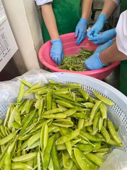 今日は、朝から調理員さんがえんどう豆をさやから出して調理してくれました。