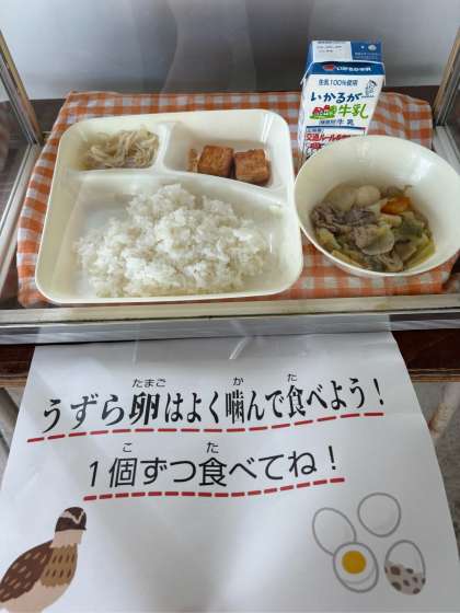 給食では、豚肉、うずら卵、キャベツ、玉ねぎ、にんじん、たけのこ、ピーマン、しいたけを使っています。