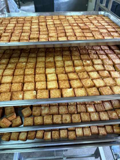 あつあげは、蒸し焼きにして、砂糖、こいくちしょうゆ、トウバンジャンを合わせて煮、厚揚げにかけて作ります。