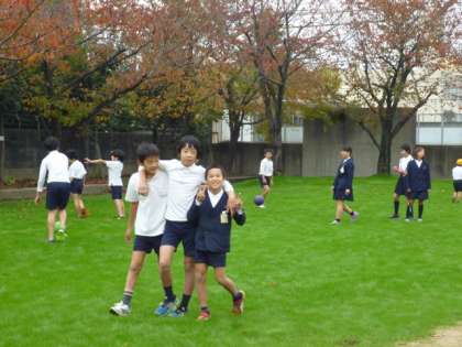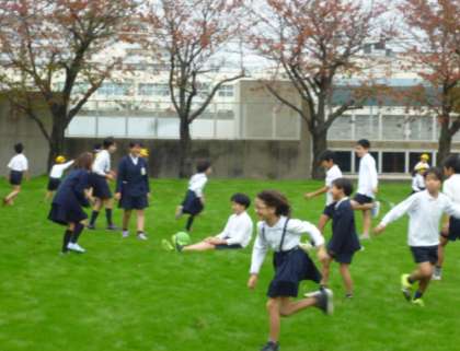 朝一番に、積もりに積もった「桜の落ち葉」を管理作業員さんが清掃、1時間目の後の休みにはもうたくさんの子ども達が、きれいになった緑の芝生を楽しんでいました。