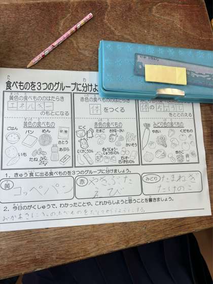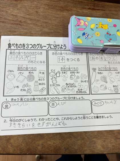 「食べ物を3つのグループに分ける」という内容で「赤」「黄」「緑」に分ける。その食品を食べるとどのように体に良いかよくわかる授業でした。今日の
