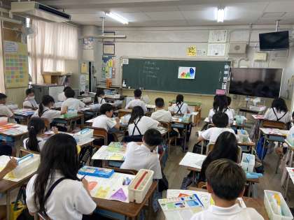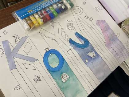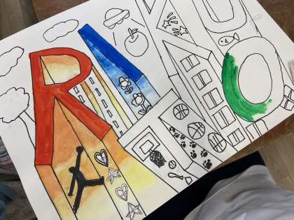 名前でつくった建物に、自分の好きなものを組み合わせて町をつくりました。絵の具を使ってグラデーションの練習をしています。完成が楽しみですね?