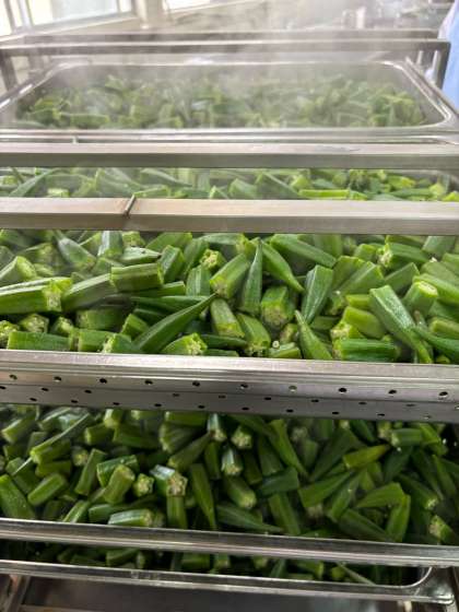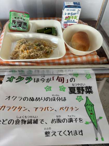 オクラは、今が旬の夏野菜です。オクラのぬめりの成分は、ガラクタン、アラバン、ペクチンなどの食物繊維で、おなかの調子を整えてくれます。今日は、高知県産のオクラを17キログラム使用しました。