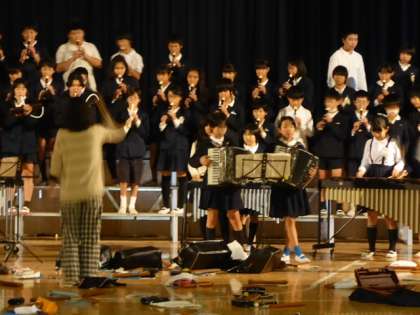 6年生は、タモリが司会をするミュージックステーションという音楽番組を模して、6年生みんなで歌ったり演奏したりします。途中にはCMやランキング発表などのコーナーもあります。