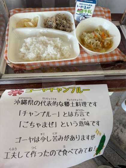 ゴーヤチャンプルーでした。「チャンプルー」とは、沖縄県の方言で「ごちゃまぜ」という意味で、いろいろな食材を炒めた料理です。