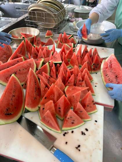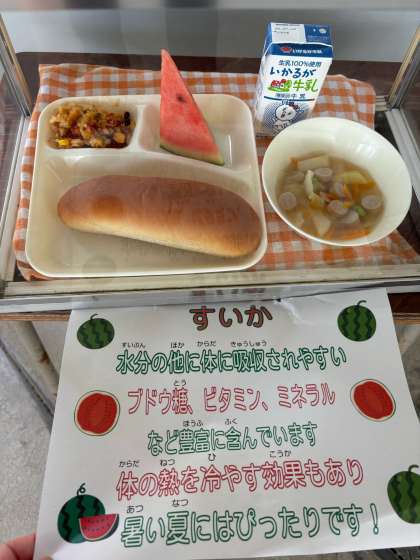 今日は、スイカもでました。鳥取県、大栄産のスイカで甘くておいしかったです。スイカの皮まできれいに食べている子どももいました。