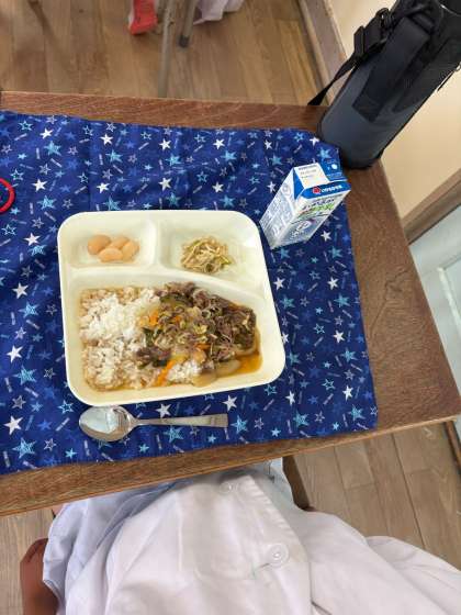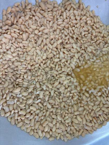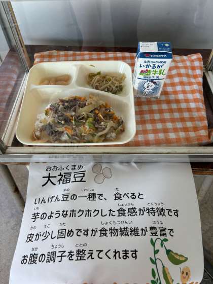 大福豆は、「インゲン豆」のなかまです。体を作るもとになるタンパク質や、おなかの調子を整える働きのある食物繊維などを含んでいます。給食では、甘い味付けの煮ものにしています。