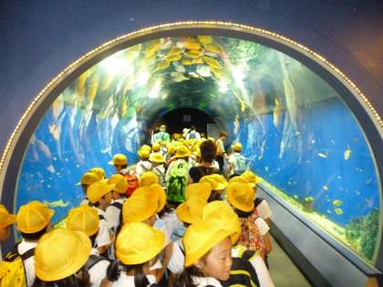 一番人気はやっぱり大水槽を悠々と泳ぐジンベイザメ。回遊してくるたびに大喜び、大きな歓声を上げていました。