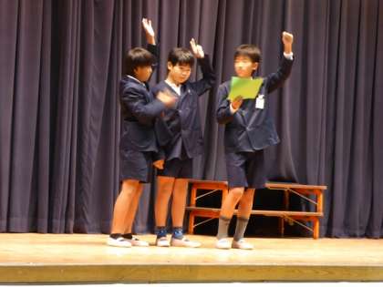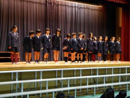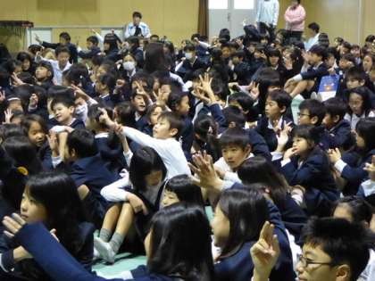 木曜日の朝は児童集会、今朝は体育館での縦割り班で集まりました。