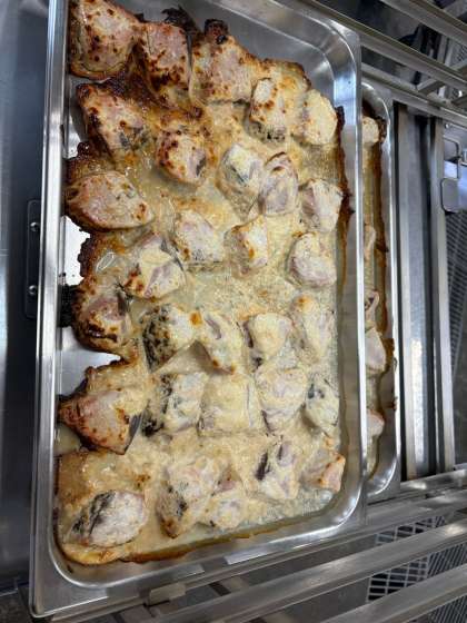 今日の給食は、かつおのガーリックマリネ焼きでした。マリネ焼きには、ノンエッグマヨネーズが使用されています。卵アレルギーがある人も食べることができます。魚が苦手な子どもが多いですが今日のマリネは、食べやすく好評でした。