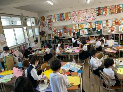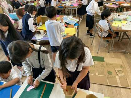 今日の図工では、わりピンを使って作品づくりをしました。わりピンを使っての作品づくりは初めてだったので、最初は「難しいそう〜」と言っていましたが、作品づくりを始めると上手に目うちを使って穴を開け、わりピンをつけていました。