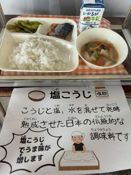 今日は、給食初登場の塩こうじを使ったさごしの塩こうじ焼きがでました。塩こうじは、米こうじと塩、水だけで作る発酵調味料です。