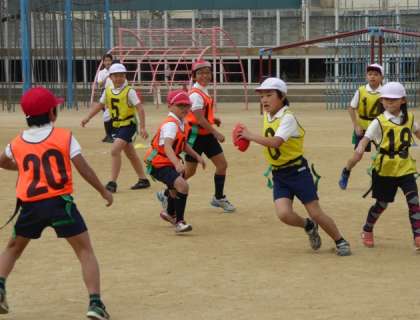5年生が「サッカー」なら、4年生はニュースポーツ「タグ・ラグビー」