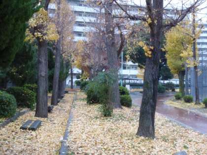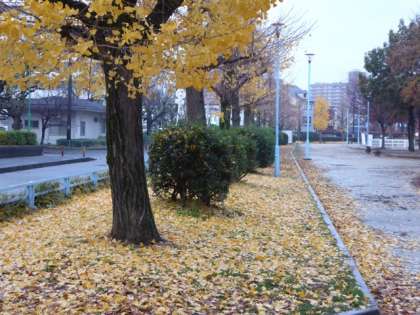 中央公園のイチョウも葉を落とし、黄色いじゅうたんが敷き詰められています。