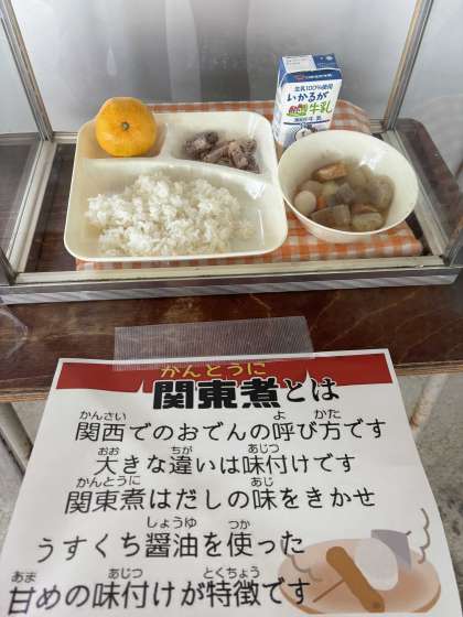今日の給食では、鶏肉、うずら卵、ごぼう平天、じゃがいも、こんにゃく、あつあげ、だいこん、にんじんが使われています。寒い日に温まる一品でした。レンコンの赤じそあえも食べてみたら美味しいと好評でした。みかんは、好きな子どもが多く各クラスでじゃんけんの声が響いていました。