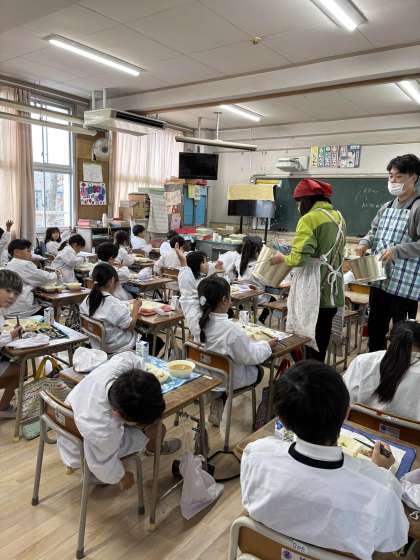 地場産物とは、住んでいる地域で作られた食べ物のことをいいます。近い場所で作られ、運ばれるので、新鮮な物が手に入ります。地場産物を学校給食に使うことで、地域の自然や食文化などを学ぶことができます。今日の給食は、大阪で作られた菊菜を使っています。
