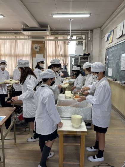 和風焼きそばは、豚肉を炒め、にんじん、玉ねぎ、ピーマン、キャベツの順に炒める。炒まれば、塩、こしょう、うすくちしょうゆ、こいくちしょうゆで味付けし、麺を加えて炒めて作ります。かつおぶしをかけていただきました。きゅうりのしょうが漬けは、しょうががきいておいしかったです。今日もどのクラスも完食していました。