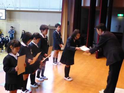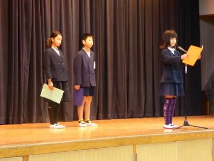 「読書感想文」の表彰状を壇上で一人一人に手渡し、みんなから大きな拍手を浴びていました。