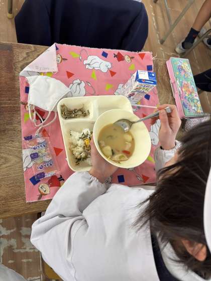 ぞう煮も行事食です。今日のぞう煮に使われている金時にんじんは、なにわの伝統野菜の一つです。お餅が柔らかくて美味しいと言って大好評でした。