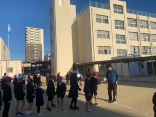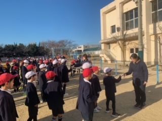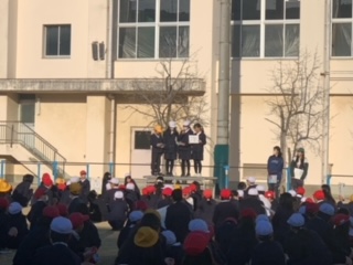 今日は児童集会でじゃんけんゲームをしました。じゃんけんゲームの後、代表委員の児童が12月の赤い羽根募金についてお話しました。
