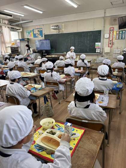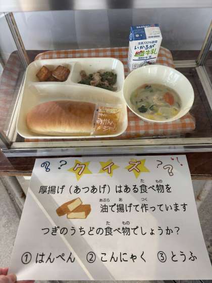 牛乳には、骨や歯を丈夫にするカルシウム、筋肉や血を作るタンパク質のほか、ビタミン類などが含まれています。白菜のクリーム煮は、牛乳やクリームが入って大好評でした。あつあげのピリ辛じょうゆかけも甘辛いタレがかかって美味しかったです。