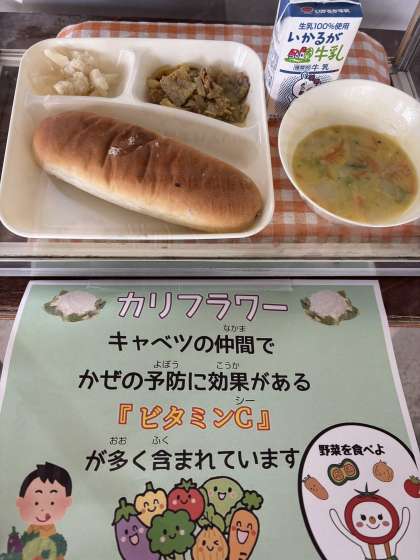 今日は、カリフラワーを茹でてピクルスにしました。豚肉のカレー風味焼きとコーンスープも好評でした。
