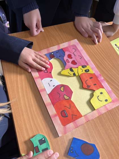 図画工作科の授業で、糸のこぎりを使って木材を切り取り、色をつけてパズルを作りました。