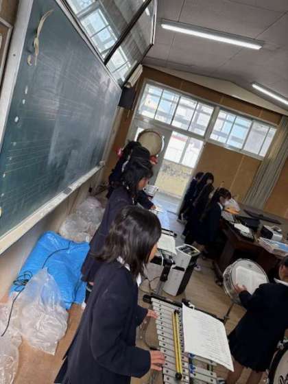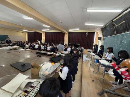 1年生は入学式のお迎えの合奏の練習をしています。セリフを大きな声で言う、友だちの音を聞ききながら合奏をする練習をしています。