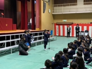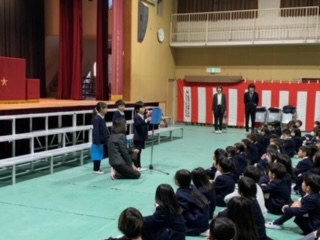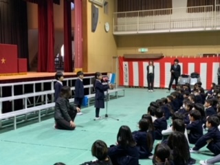 1年生の代表の児童が「楽しかった1年間の思い出」の作文を読んでいる様子です。