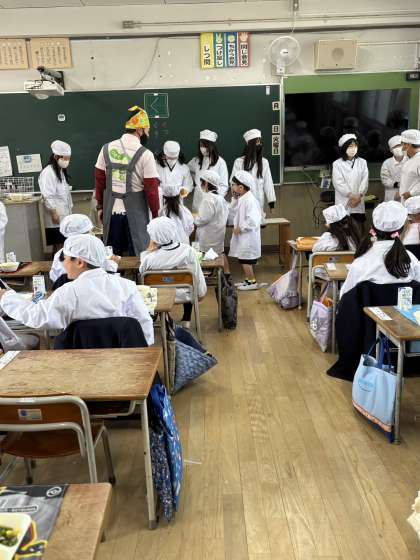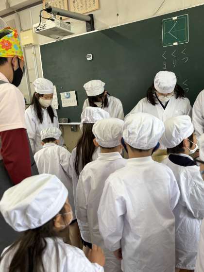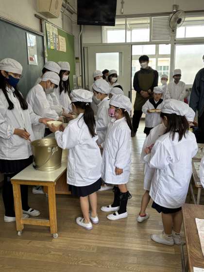 今日の給食時間の様子です。一年生の給食のお手伝いを6年生がしてくれています。