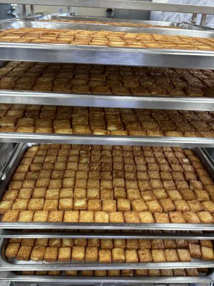 あつあげのしょうゆだれかけは、焼物機で焼いたあつあげに砂糖、みりん、こいくち醤油で煮立てたタレをかけて作ります。