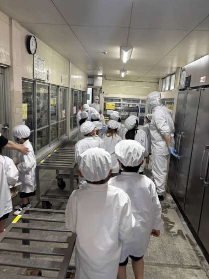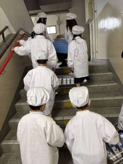 まぐろには、体をつくるもとになるタンパク質が多く含まれています。脂質には、血の流れをよくするエイコサペンタエン酸や脳の働きを活発にするドコサヘキサエン酸が含まれています。今日から一年生は、自分たちで給食を取りに行きました。「重い」といいながらも一生懸命運んでいました。