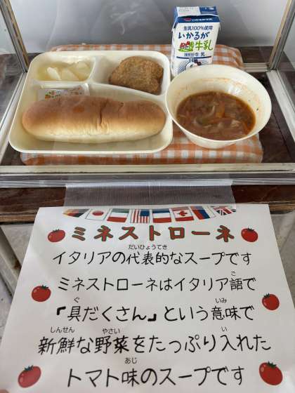 今日のミネストローネは、鶏肉とキャベツ、玉ねぎ、にんじん、トマトなどの野菜が使われています。とんかつは、カラッと揚がっていて大好評でした。