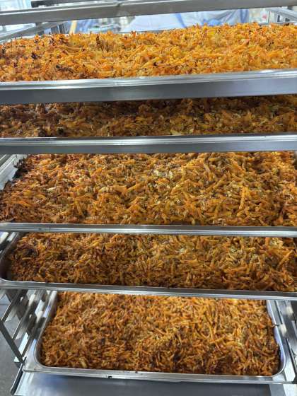沖縄県の家庭料理の一つに「にんじんシリシリー」があります。「シリシリー器」と呼ばれるおろし金を使い、すりおろしたにんじんを炒め、卵でとじた料理です。また「シリシリー」は、すりおろす時の音の「すりすり」を表す沖縄県の方言です。今日の給食では、細切りにしたにんじん、ささみ、カツオ節と調味料を混ぜ合わせ、焼き物で焼きます。卵は、使ってません。今日の沖縄料理は、どれも大好評でした。