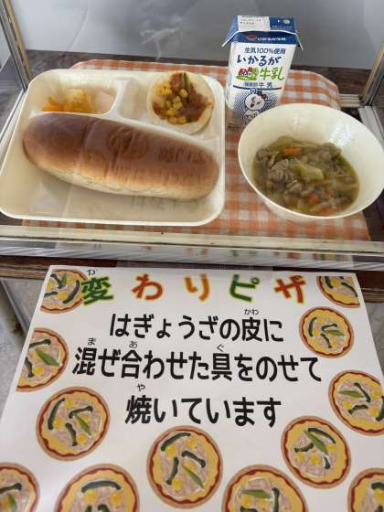 朝から調理員さんが730枚のぎょうざの皮にピザの具をのせてパリッと焼いてくれました。大好評でした。