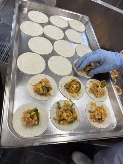 給食の変わりピザは、ぎょうざの皮に新食品の「乳なしチーズ」とツナ、コーン、ピザソースを混ぜ合わせた具をのせ、焼き物で焼いています。
