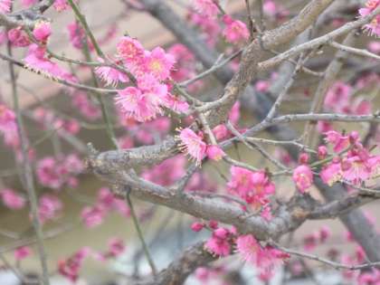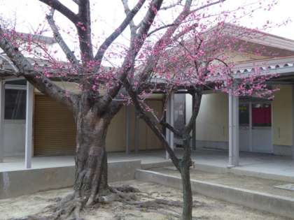 ビオトープの白梅に続き、給食室前の紅梅もすでに開花。