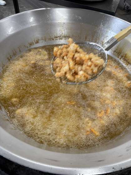 また、骨や歯を作るもとになるカルシウムも含まれています。えびは、下味をつけてでんぷんをまぶし、熱した油で揚げます。別釜に油を熱してしょうがニンニク、トウバンジャンを香りよく炒め、玉ねぎを炒める。炒まれば、砂糖、濃い口しょうゆ、ケチャップを合わせて煮、揚げたえびにからませて作ります。ピリ辛ですがおいしいと好評でした。