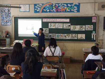 5時間目、5年1組(菊池先生)、外国語活動(英語)の授業です。