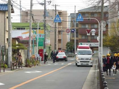 突然のサイレンと点滅するパトランプに登校中の子ども達もビックリ、登校してくる児童に口をそろえて「せんせぇ、何があったん?」と聞かれました。
