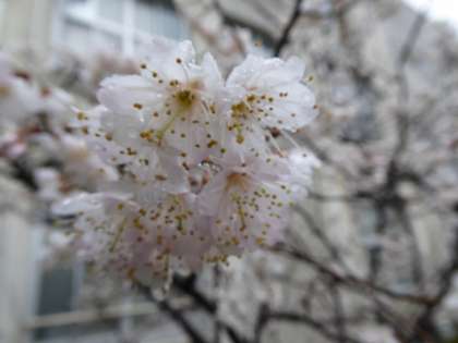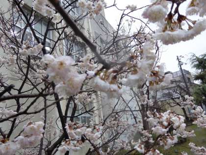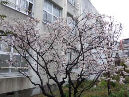 ちょうど職員室の裏庭(旧正門側)でもう「桜」が満開???