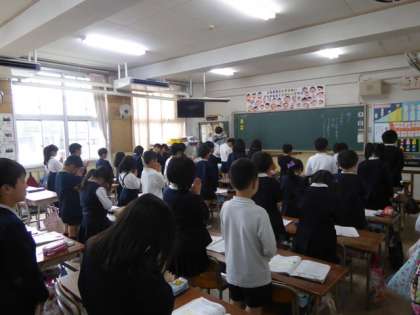 地震発生時間より少し早い、午後2時25分からの1分間、東北大震災で犠牲になった人たちのご冥福を祈り、全校一斉に黙とうをささげました。