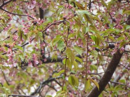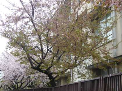 一番開花が早かった家庭科室の裏の桜が早「葉桜」に。一本だけというのも不思議ですが、今日を含めてあと4日、「桜の木よ、がんばれ、がんばれ、がんばれ〜!!」
