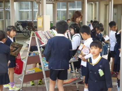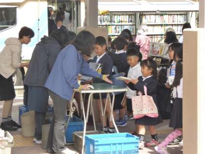 地域や保護者の方々とともに、休み時間には、かばん一杯に借りていた本をいれた子ども達がぞくぞくと集まってきます。